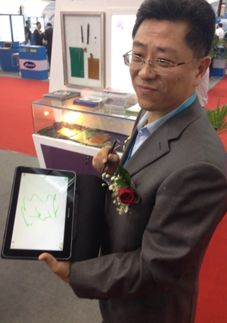柳总:当然,这个产品里可以放入一些软件,本身就支持我的笔,用户用不用这支笔无所谓,对用户来讲是一个选择,当某一天想用的时候在网上买一支就好了,还有各种各样的选择,大中小、各种形状、各种粗细,不用ok,本身这个产品可以继续用手,这是我们另一类技术,电容式的笔,而不是电磁式的,而且在这个领域里头汉王是目前为止做得相当好的。我们现在整个的企业策略、使命之一就是做笔,我们专注在笔上,整个市场不管技术发展到什么层面,不管有什么新兴技术出现,对笔而言我们都会去研究,我们跟着市场走。